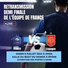 Rendez-vous salle du Bout du Monde à partir de 20h30 pour vivre en direct et sur écran géant la demi-finale : la France face à l’Espagne.